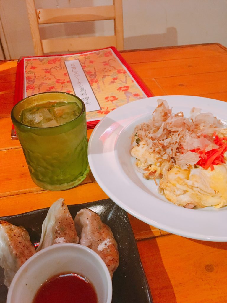 チャンプルー&鉄板焼き餃子。焼酎がすすむ×2!