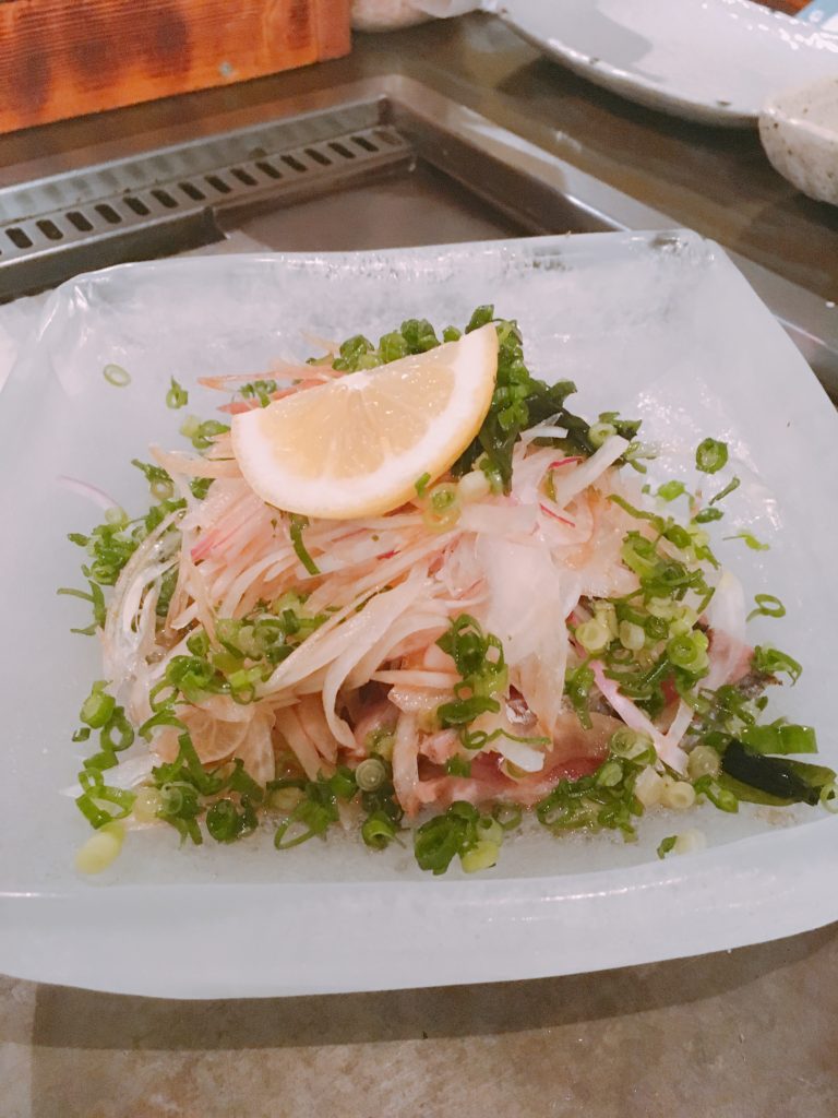 季節のメニュー。カツオのタタキ。お皿も冷えてます!
